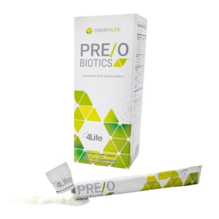 ¡Dale amor a tus intestinos! Pre/o Biotics es el único producto prebiótico/probiótico en el mundo que está reforzado con 4Life Transfer Factor. Esta mezcla exclusiva y evaluada en la universidad contiene cinco cepas de probióticos ampliamente investigados que promueven el crecimiento de la flora intestinal beneficiosa en tus intestinos, así como tres tipos de probióticos para optimizar el crecimiento de los probióticos saludables. Con nuestro método exclusivo de administración a través de microesferas, los probióticos son llevados directamente al colon, permitiendo así que Pre/o Biotics aumente la cantidad y longevidad de la flora intestinal beneficiosa hasta 1,000 veces más que una administración estándar. Además, la incorporación de 4Life Tri-Factor Formula estimula el crecimiento de los probióticos que se encuentran en Pre/o Biotics hasta por un 868%. Pre/o Biotics también contribuye a reforzar la función del sistema inmunitario, especialmente porque un alto porcentaje de tu sistema inmunitario se concentra en tus intestinos. Consume un paquete con un agradable sabor a limón al día para obtener resultados óptimos, ¡y recuerda que no debes masticar las microesferas