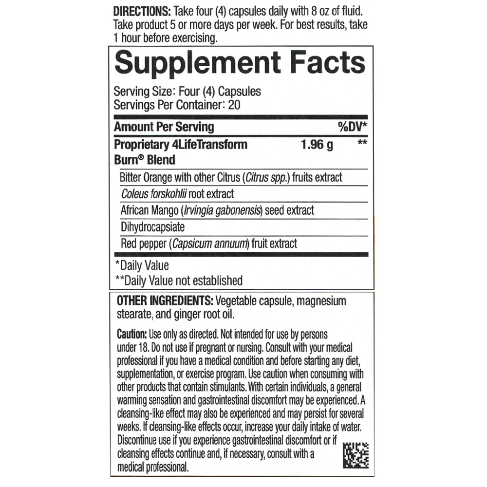 Toma cuatro (4) cápsulas diarias una hora antes de tu rutina de ejercicios para maximizar los resultados en tu búsqueda de un cuerpo más delgado, esbelto y saludable.* 4LifeTransform Burn viene en cápsulas de origen vegetal.