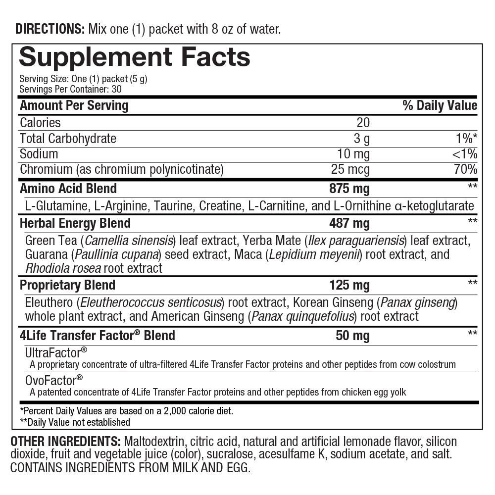 Paquetes cargados con 4Life Transfer Factor y una mezcla de ingredientes energéticos para llevar contigo