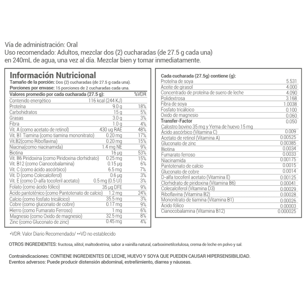 Con solo 120 calorías por porción, su composición incluye saborizantes, edulcorantes y colorantes naturales, ofreciendo un agradable sabor a vainilla para una experiencia deliciosa y saludable