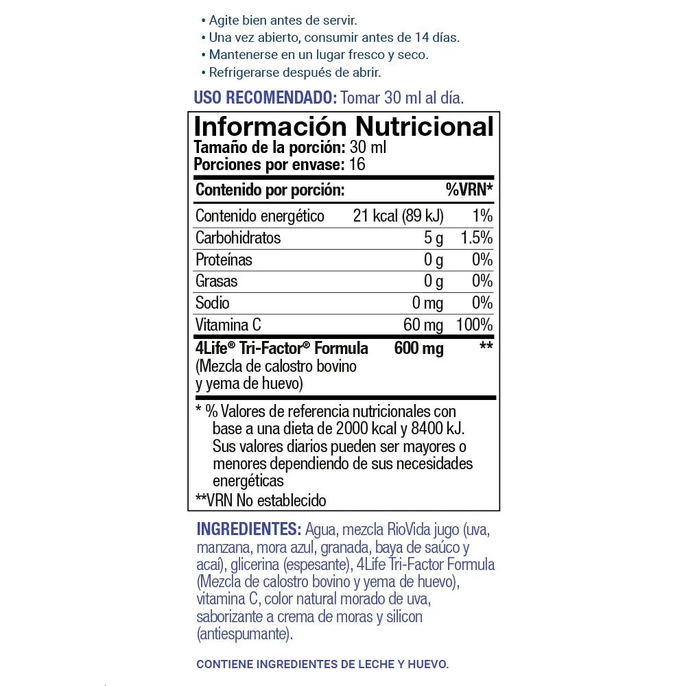 Riovida de 4Life contiene 4Life Transfer Factor, cuya eficacia clínicamente probada activa el sistema inmunitario en tan solo dos horas. Respaldamos la capacidad natural del sistema inmunológico para identificar, responder y recordar posibles amenazas, gracias a los 600 mg de 4Life Transfer Factor presentes en este producto. Además, disfruta de una combinación exclusiva de antioxidantes y jugos de frutas ricos en bioflavonoides naturales, que incluyen açaí, granada, arándano y baya del saúco. Enriquecido con vitamina C, aminoácidos, ácidos grasos y polifenoles, este producto proporciona un completo apoyo para tu bienestar. Contiene 4Life Transfer Factor® certificado, diseñado para potenciar la inteligencia de tu sistema inmunológico.